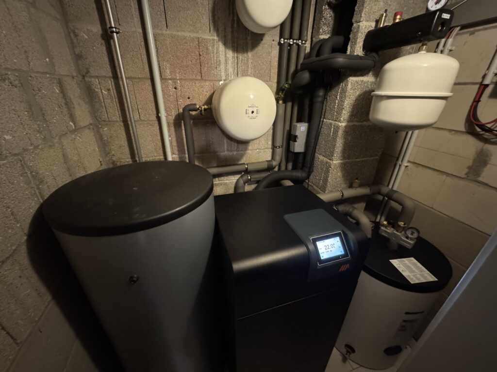 Die Wärmepumpe für die Sole/Wasser-Anwendung wurde ebenfalls installiert, um das Haus effizient mit Heizwärme zu versorgen und gleichzeitig die Warmwasserbereitung zu ermöglichen. Ein moderner Edelstahl-Warmwasserspeicher ergänzt die Installation für maximale Effizienz.